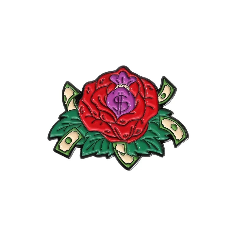 Tento pin ve tvaru květu zaujme kombinací výrazné růže a detailu s pytlíkem peněz. Motiv propojuje klasický květinový vzhled s prvky inspirovanými bankovkami, což vytváří netradiční vizuální kontrast. Díky výrazné červené barvě květu a zeleným listům je odznak dobře viditelný i na jednobarevném oblečení. Velikost umožňuje pohodlné nošení bez rušení celkového stylu.