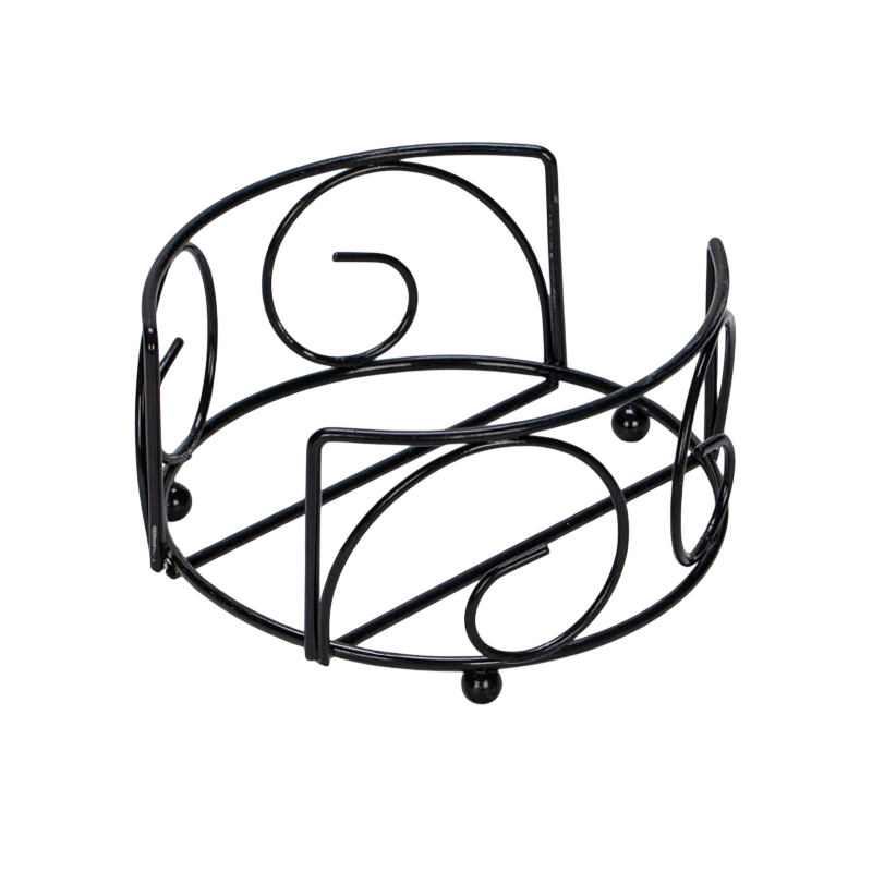 Držák je vyroben z kovového materiálu, který tvoří pevnou konstrukci. Kovové provedení je doplněno dekorativním designem s jemnými křivkami, které mohou působit jako zajímavý prvek mezi kuchyňskými doplňky.