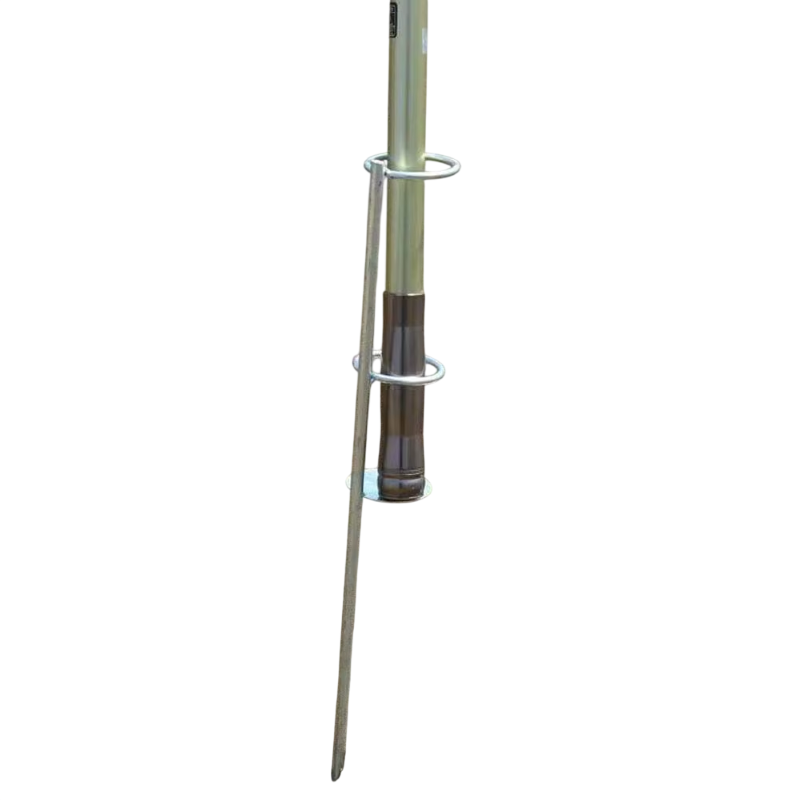 Držák má délku 30 cm, což poskytuje dostatečnou oporu i v měkčím terénu. Je vyroben z oceli, která zajišťuje pevnost a odolnost při běžném používání. Horní část je vybavena kruhovými prvky pro uchycení prutu a lepší stabilitu.
