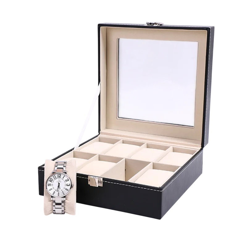 Organizér pro osm hodinek s přehledným členěním a víkem s okénkem. Praktické řešení pro uložení kolekce na jednom místě doma. Celý popis