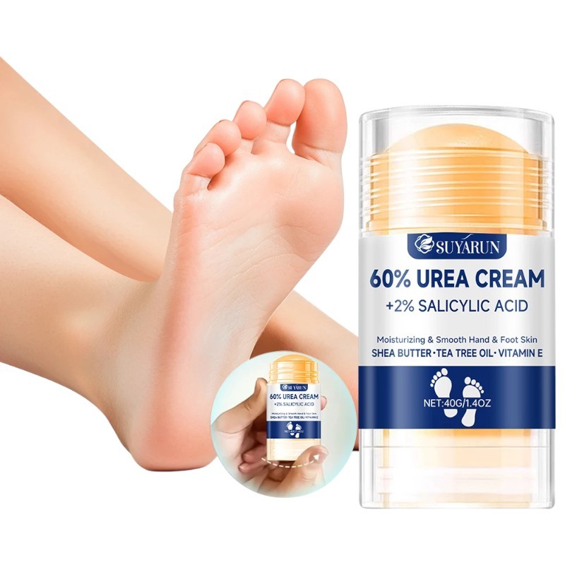 Hydratační a exfoliační krém na nohy v praktické tyčince je určen pro intenzivní péči o suchou, ztvrdlou a popraskanou pokožku chodidel. Kombinuje vysoký obsah 60 % močoviny s 2 % kyseliny salicylové, které společně pomáhají změkčovat zrohovatělou kůži a podporují její obnovu. Pevná tyčinková forma umožňuje přesnou aplikaci přímo na problematická místa bez zbytečného kontaktu s rukama. Pravidelné používání přispívá k viditelně hladším patám a dlouhodobému komfortu pokožky.