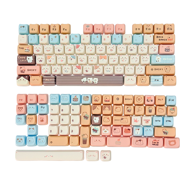 Sada krytek na klávesy pro mechanickou klávesnici je navržena pro uživatele, kteří chtějí změnit vzhled své klávesnice a doplnit ji o hravý motiv. Na klávesách jsou viditelné ilustrace koček, dezertů a drobných dekorativních detailů. Barevné provedení kombinuje pastelové odstíny modré, růžové, béžové a bílé, které působí jemně a čistě. V balení se nachází 142 ks krytek, což umožňuje široké využití při osazení různých kláves. Materiál PBT je oblíbený pro pevný povrch a vhodný pro pravidelné používání.