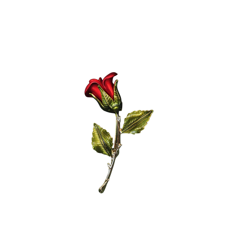 Tato květinová brož ve tvaru růže zaujme kombinací červeného květu a zelených listů, které společně vytvářejí přirozený a vyvážený vzhled. Jemně tvarovaný stonek doplňuje celkový design a dodává broži elegantní charakter. Díky tomuto provedení se hodí jako univerzální doplněk k různým stylům oblečení.