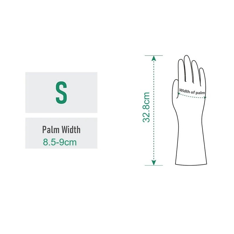 Velikost S odpovídá šířce dlaně přibližně 8,5–9 cm a je vhodná pro menší ruce. Délka cca 32,8 cm zajišťuje ochranu nejen dlaní, ale i části zápěstí. Bavlněná výstelka uvnitř rukavic zvyšuje pohodlí při práci. Protiskluzový úchop pomáhá při manipulaci s nádobím nebo čisticími pomůckami. Voděodolné a opakovaně použitelné provedení umožňuje dlouhodobé využití.