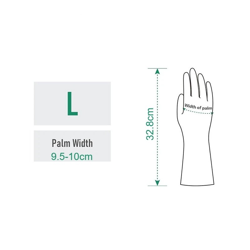 Velikost L odpovídá šířce dlaně přibližně 9,5–10 cm, což je vhodné pro větší ruce. Délka cca 32,8 cm poskytuje rozšířenou ochranu také v oblasti zápěstí. Bavlněná podšívka zvyšuje komfort při používání. Protiskluzový úchop napomáhá pevnějšímu držení nádobí nebo čisticích pomůcek. Voděodolné a opakovaně použitelné provedení umožňuje dlouhodobé využití při každodenním úklidu.