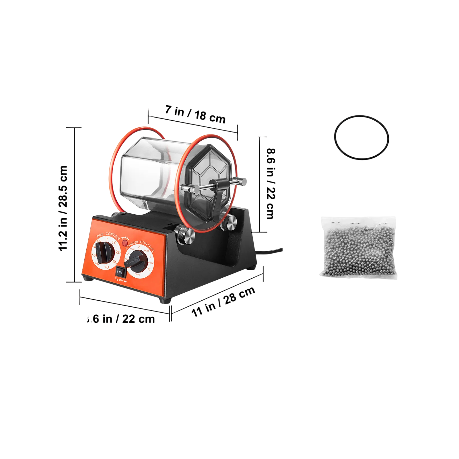 Leštička šperků a drahokamů 5 kg 60 W bubnový lešticí stroj černo oranžový pro úpravu povrchů šperků a kamenů