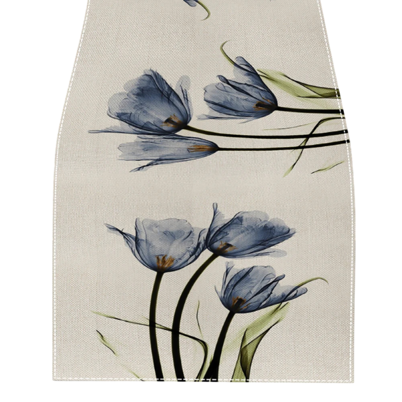 Lněný běhoun na stůl s motivem tulipánů rustikální farmářský styl 33 × 183 cm lněná stolní dekorace na kuchyňský jídelní stůl