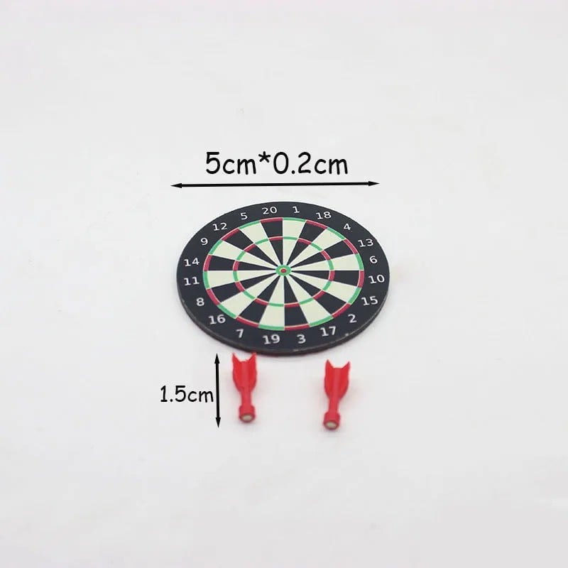 Terč má průměr přibližně 5 cm a je doplněn malými šipkami o velikosti cca 1,5 cm. I přes malé rozměry jsou zachovány charakteristické detaily, jako jsou barevná pole a číslování, což dodává produktu realistický vzhled. Díky tomu působí jako miniatura skutečného terče.