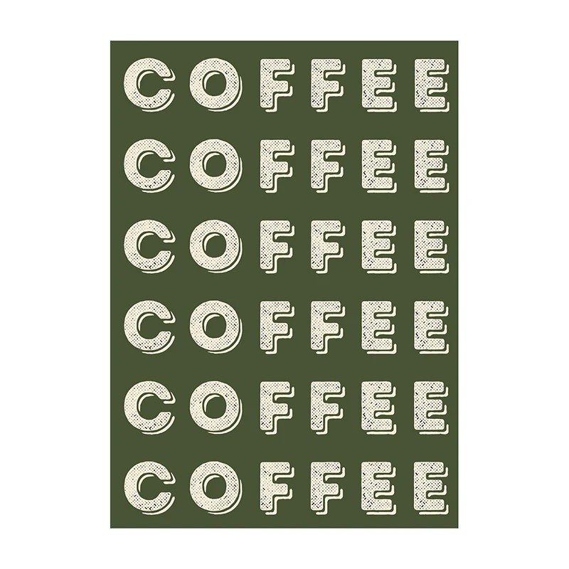 Plakát s opakujícím se motivem coffee v čistém typografickém stylu. Vhodný do kuchyně, jídelny nebo kavárny jako jednoduchá dekorace. Celý popis
