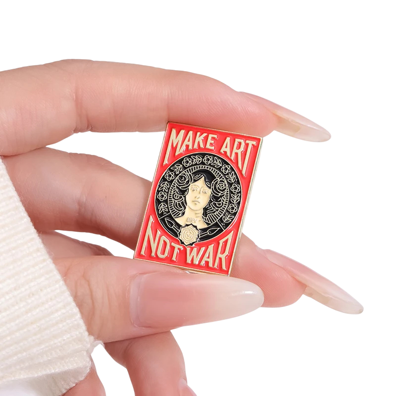 Módní brož 1,7 x 2,7 cm Červený design S nápisem Make Art Not War Výrazný kovový doplněk Ze zinkové slitiny