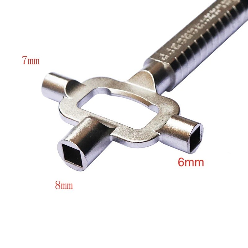 Multifunkční zámečnický klíč 138 × 66 mm kovový nástroj se stupnicí a hlavicemi 6 mm, 7 mm, 8 mm pro práci se zámky