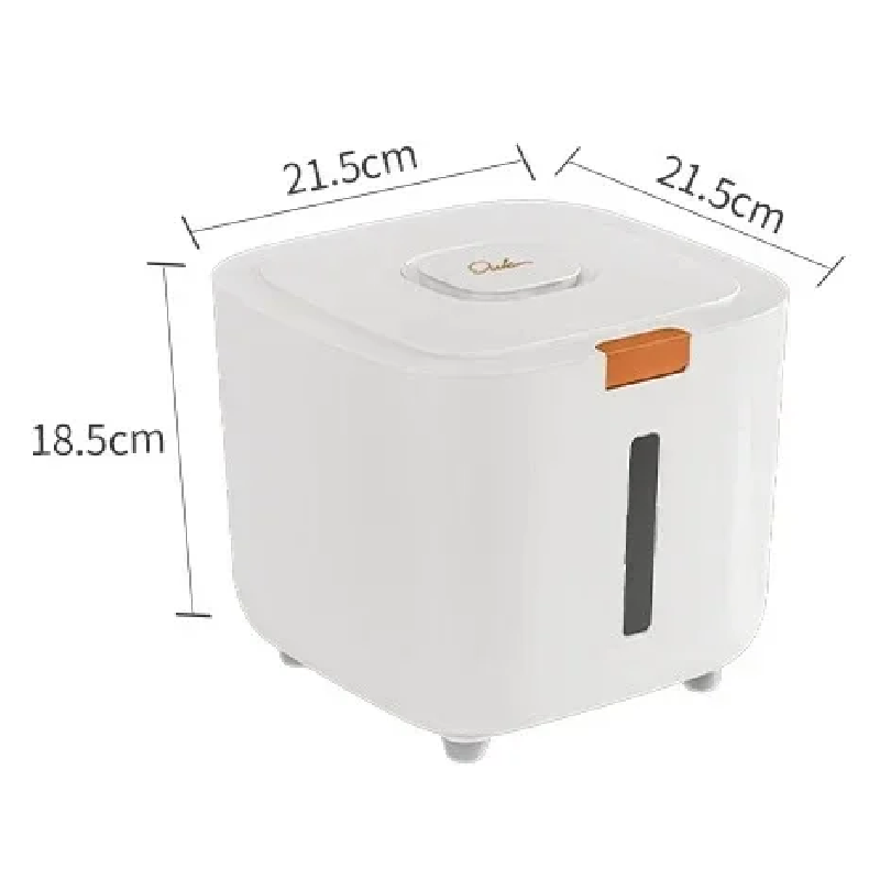 Nádoba má moderní design v bílé barvě, který se hodí do každé domácnosti. Její rozměry 21,5 x 21,5 x 18,5 cm zaručují dostatečný objem pro skladování sypkého krmiva, rýže, mouky nebo jiných potravin. Lehká konstrukce a ergonomické provedení zajišťují snadnou manipulaci a údržbu.