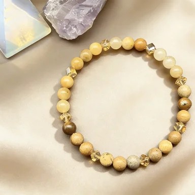 Elastický náramek z přírodního citrínu s jemnými barevnými přechody. Každý kus je originál díky přirozené kresbě kamene. Celý popis