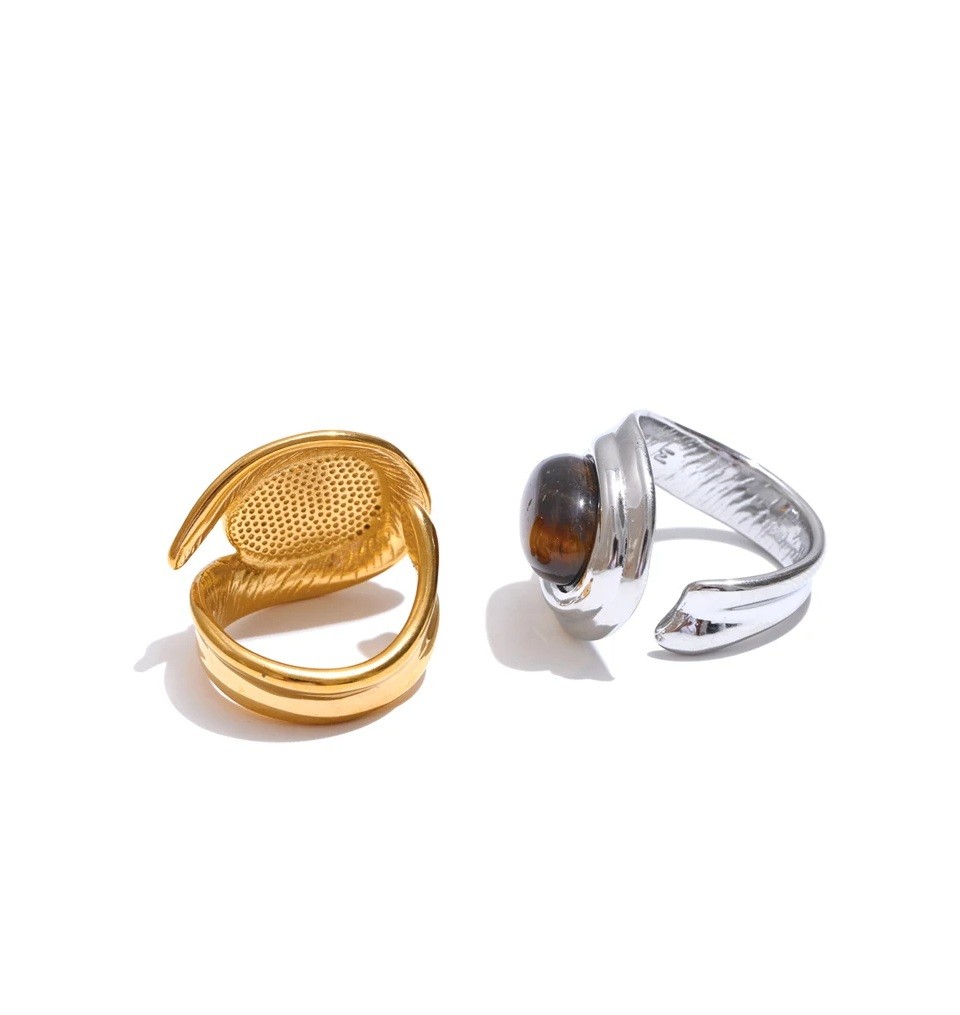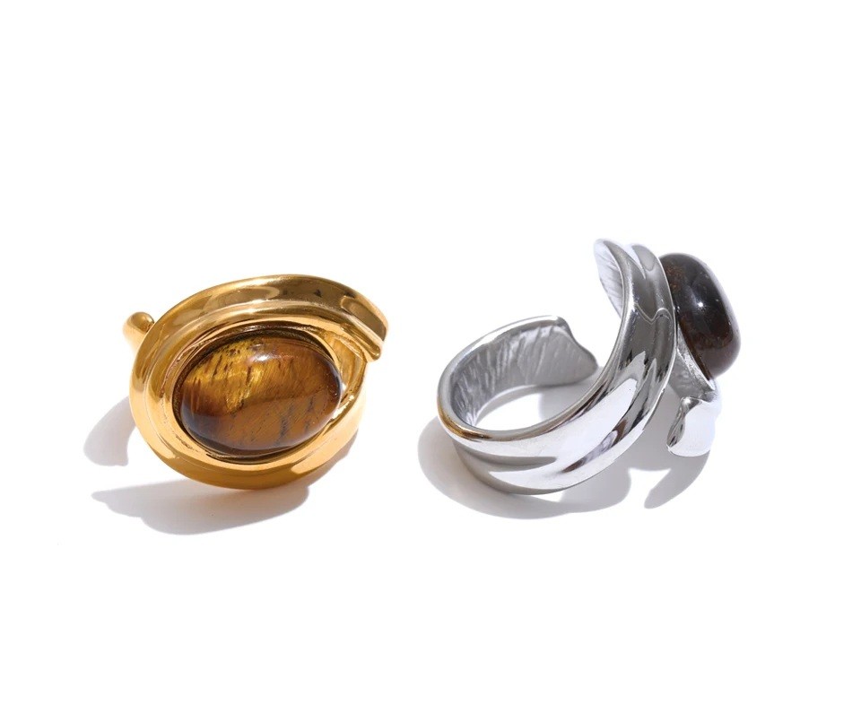 Nastavitelný prsten s oválným kamenem 18,5 mm, robustní plasticky tvarovaná obroučka, výrazný moderní šperk s dominantním dekorem Tento prsten na první pohled upoutá výrazným oválným kamenem o velikosti přibližně 18,5 mm, který je zasazen do plasticky tvarovaného lůžka a tvoří hlavní dominantu celého šperku. Kámen vyniká svým hladkým povrchem a přirozeným tvarem, který působí elegantně a zároveň velmi výrazně. Obroučka má nastavitelné provedení, takže se pohodlně přizpůsobí různým velikostem prstu. Robustnější tvar obroučky s jemnými organickými liniemi vytváří harmonický celek a dodává prstenu osobitý, moderní charakter. Celkový design kombinuje výrazný středový prvek s čistými liniemi, což z něj činí nepřehlédnutelný doplněk.