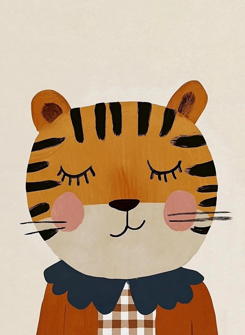 Ilustrace tygra má měkké linie a tlumené barvy, což usnadňuje kombinaci s dalším vybavením interiéru. Béžové pozadí doplněné oranžovými a černými prvky dodává plakátu vyvážený vzhled. Tento typ dekorace je vhodný nejen pro dětské prostory, ale také pro klidně laděné místnosti, kde vynikne jeho jednoduchost.