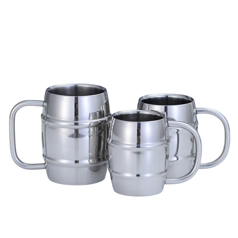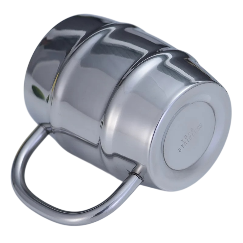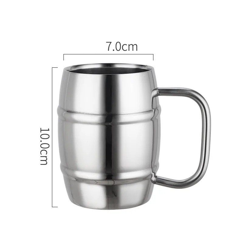 Nerezový hrnek soudkový tvar s uchem 450 ml 7 × 10 cm z nerezové oceli stříbrný na kávu čaj domácnost kancelář cestování