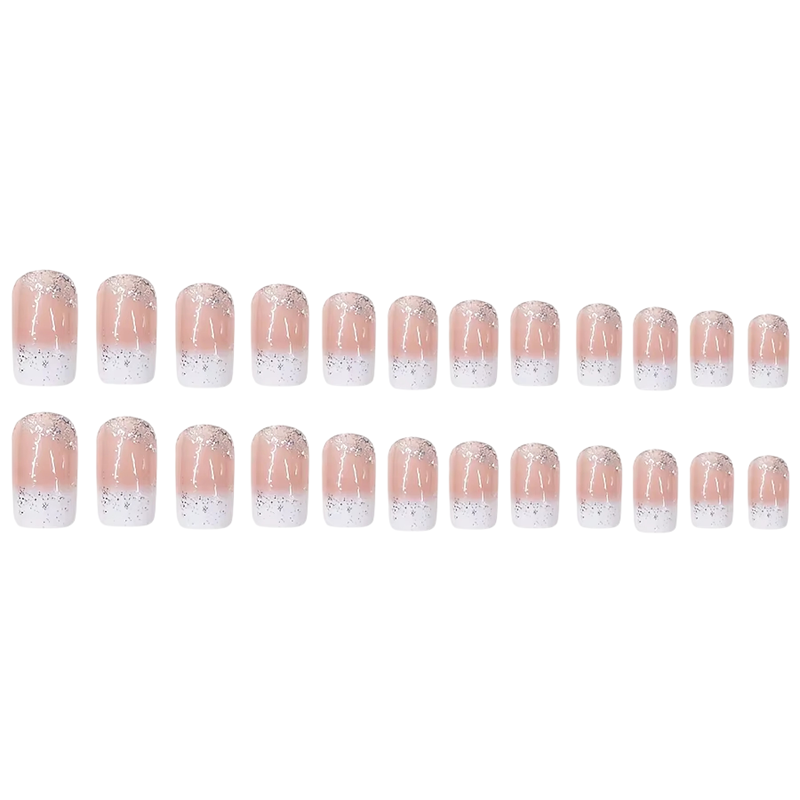 Tato sada nehtových tipů přináší propojení klasické francouzské manikúry s jemným třpytivým akcentem, který dodá vašim rukám moderní a svěží vzhled. Jemně zaoblený čtvercový (square) tvar je praktický, stylový a opticky vyvažuje nehtové lůžko, čímž podtrhuje přirozenou krásu rukou. Díky krátké až střední délce jsou nehty pohodlné při každodenních aktivitách a zároveň dostatečně reprezentativní i pro formální situace. Nositelné provedení je ideální pro domácí použití – nevyžaduje profesionální nástroje ani zkušenosti. Každý nehet je navržen tak, aby kopíroval tvar přírodního nehtu a výsledná manikúra tak působila přirozeně a čistě.