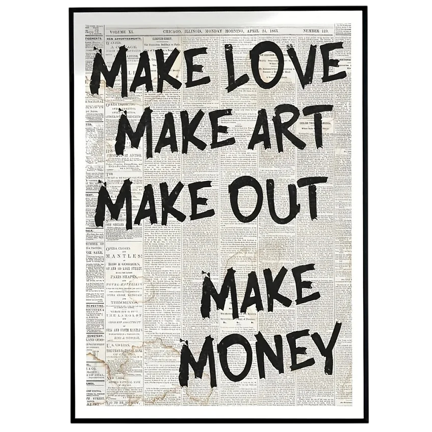 Plakát s textovým motivem přináší do prostoru výrazný vizuální prvek založený na typografii. Citát „make love, make art, make out, make money“ je rozvržen do několika řádků a díky kontrastu tmavého písma a světlého podkladu působí přehledně a čitelně. Podklad připomínající novinový tisk dodává celému motivu specifický vzhled, který zaujme na první pohled. Rozměr 50 x 70 cm umožňuje využití plakátu jako dominantního prvku na stěně.