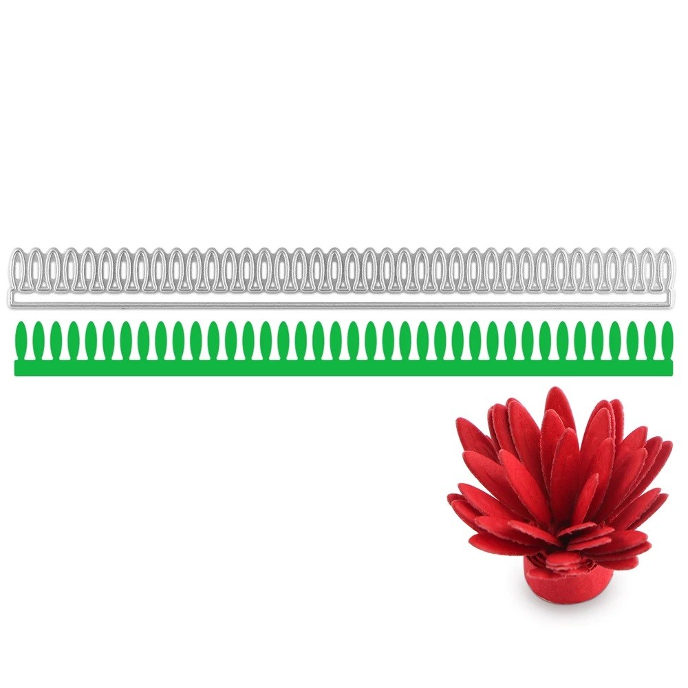Tato ocelová vyřezávací šablona je navržena pro tvorbu papírových květin pomocí proužku s pravidelně rozmístěnými oválnými lístky. Díky podlouhlému tvaru umožňuje vytvořit souvislý pás, který lze následně stočit do kompaktního květu. Výsledné dekorace mají plnější vzhled a výraznou strukturu jednotlivých vrstev.