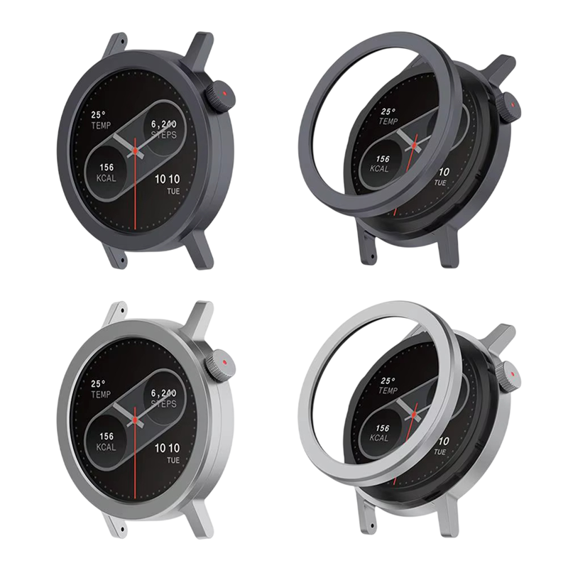 Rámeček je vyroben z oceli, která vytváří pevnou konstrukci kolem displeje hodinek. Součástí je tvrzené sklo, které je integrováno do rámečku a pokrývá obrazovku hodinek. Kombinace rámečku a skla tvoří jeden celek určený pro doplnění hodinek.