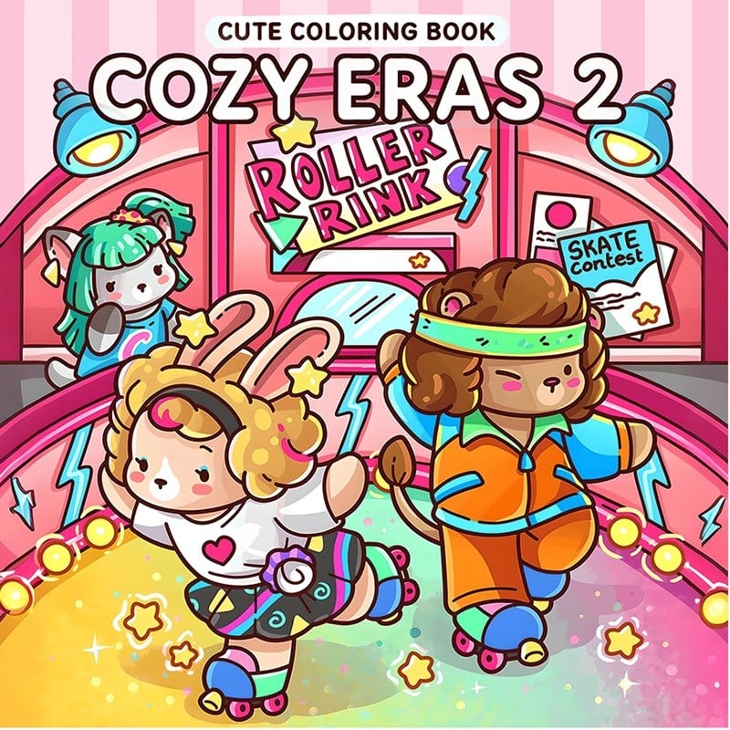Omalovánky s motivem kolečkového bruslení přinášejí hravé ilustrace inspirované retro prostředím roller rink. Styl „cozy eras“ se zaměřuje na jednoduché, roztomilé postavičky a přehledné scény, které se snadno vybarvují. Obrázky zobrazují zábavné momenty z prostředí bruslení, včetně postav na kolečkových bruslích a tematického pozadí.