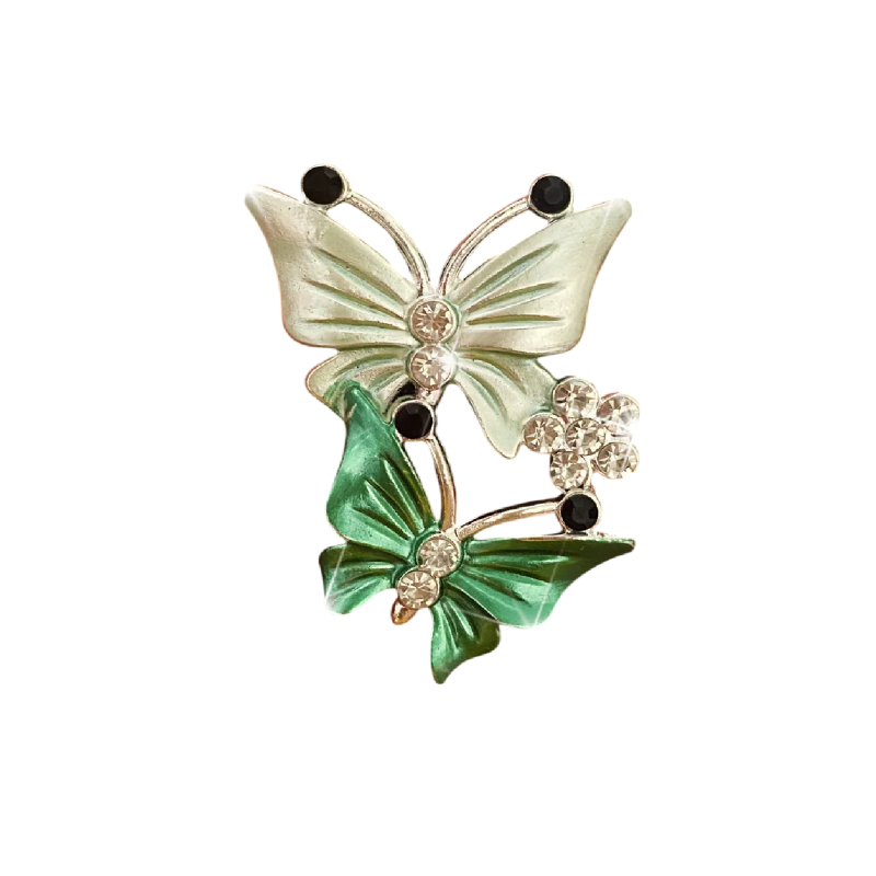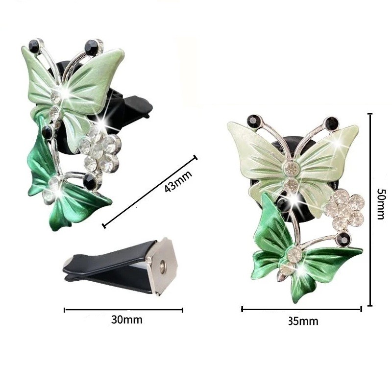 Design tvoří dvojice motýlů v dvoubarevném provedení, doplněná jemnými detaily ve formě lesklých kamínků. Kombinace světle zelených a tmavších zelených tónů spolu s kovovými prvky vytváří elegantní vzhled, který zaujme na první pohled. Celý motiv je zasazen do kompaktního tvaru vhodného pro interiér auta.