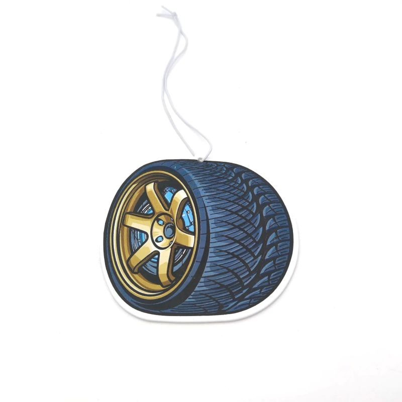 Design přívěsku je inspirován automobilovým prostředím a zobrazuje detailní ilustraci pneumatiky s výrazným vzorkem. Dominantním prvkem je zlatý disk, který je zasazen do tmavé pneumatiky s modrými akcenty. Kombinace barev a kontrastních linií vytváří dynamický vzhled, který dobře vynikne v interiéru vozu.