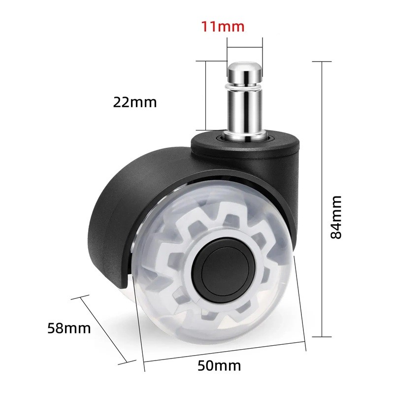 Náhradní otočná kolečka pro kancelářské židle s průměrem 50 mm a čepem 11 mm. Gumový běhoun pro tichý chod a šetrný pohyb po podlaze. Celý popis