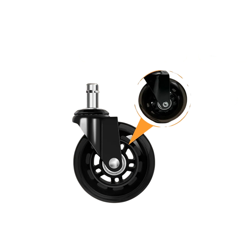 Sada otočných koleček pro kancelářské židle s čepovým uchycením. Průměr 50 mm, čep 10–11 mm, délka 22 mm. Ocelová konstrukce a gumový běhoun. Celý popis