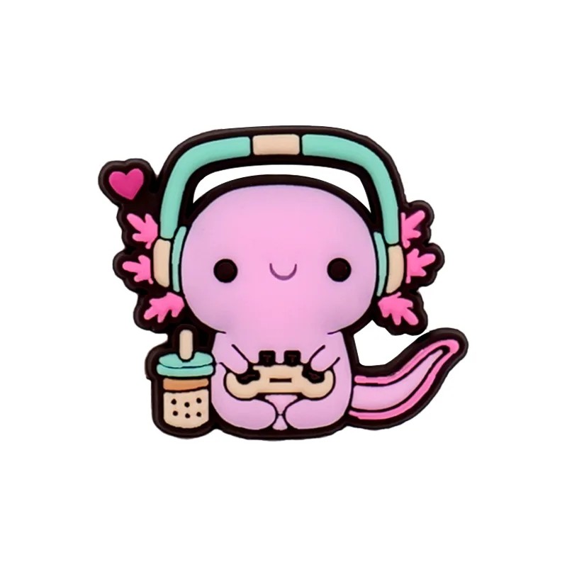 Dekorace na crocsy s motivem axolotla se sluchátky a herním ovladačem přináší zábavný a moderní prvek na vaši obuv. Kombinace roztomilého zvířete a herního stylu vytváří originální design, který zaujme na první pohled. Axolotl se sluchátky a ovladačem působí hravě a je vhodný pro každého, kdo chce dodat crocs osobitý charakter. Tento motiv se hodí jak pro samostatné použití, tak i jako doplněk k dalším ozdobám.