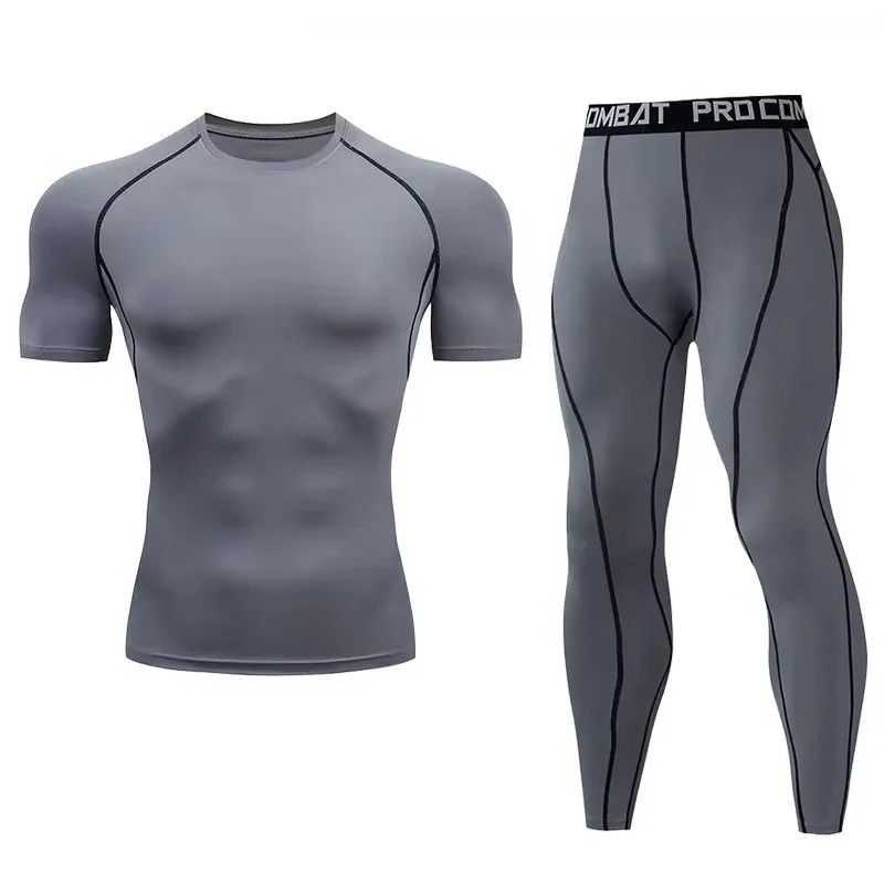 Pánská souprava s legínami a tričkem s krátkým rukávem a výstřihem do O, vyrobená z polyesteru, ideální pro pohodlné nošení a sportovní aktivity. Celý popis