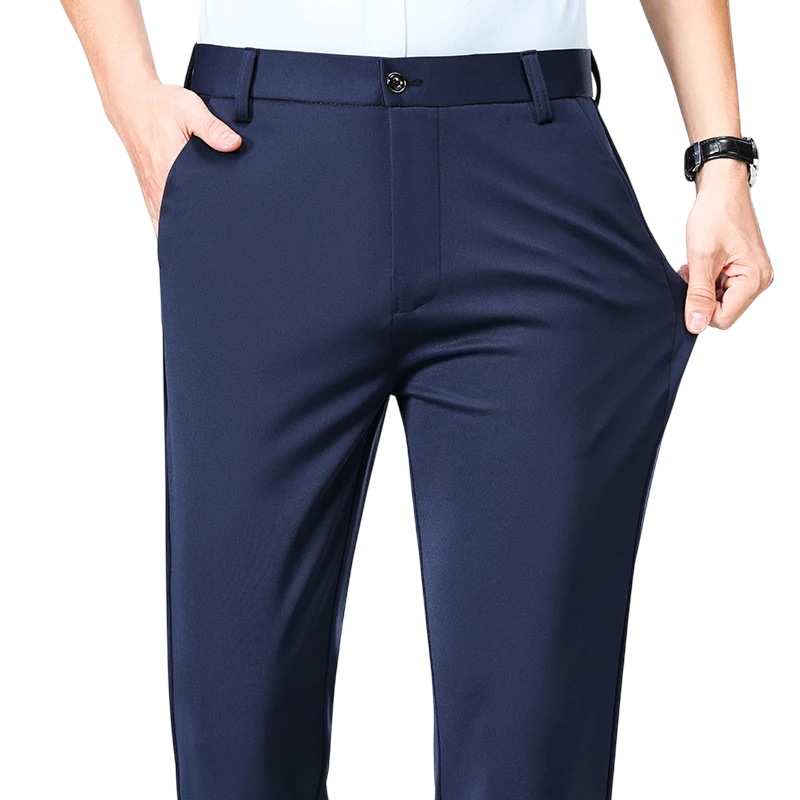Tyto kalhoty vynikají dokonalým zpracováním a kvalitními materiály, které zaručují dlouhou životnost a bezchybný vzhled i po delším nošení. Kombinace polyesteru a spandexu poskytuje potřebnou pružnost i pohodlí, aniž by se látka mačkala. Jednobarevný elegantní design umožňuje jednoduché kombinace s různými doplňky i obuví. Kalhoty jsou ideální pro muže, kteří chtějí působit stylově, sebevědomě a upraveně při jakékoli příležitosti. Pokud hledáte elegantní kalhoty s univerzálním využitím, tento model splní vaše očekávání.