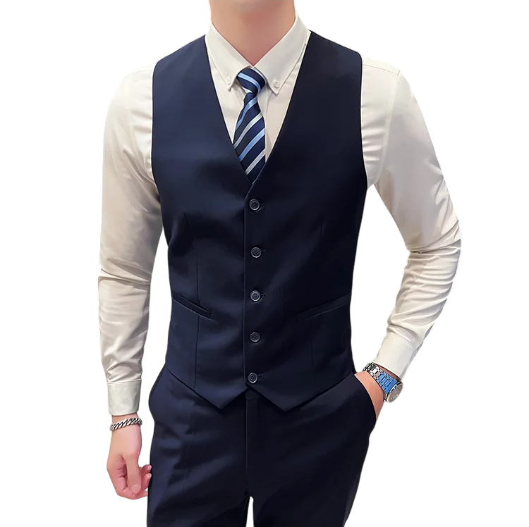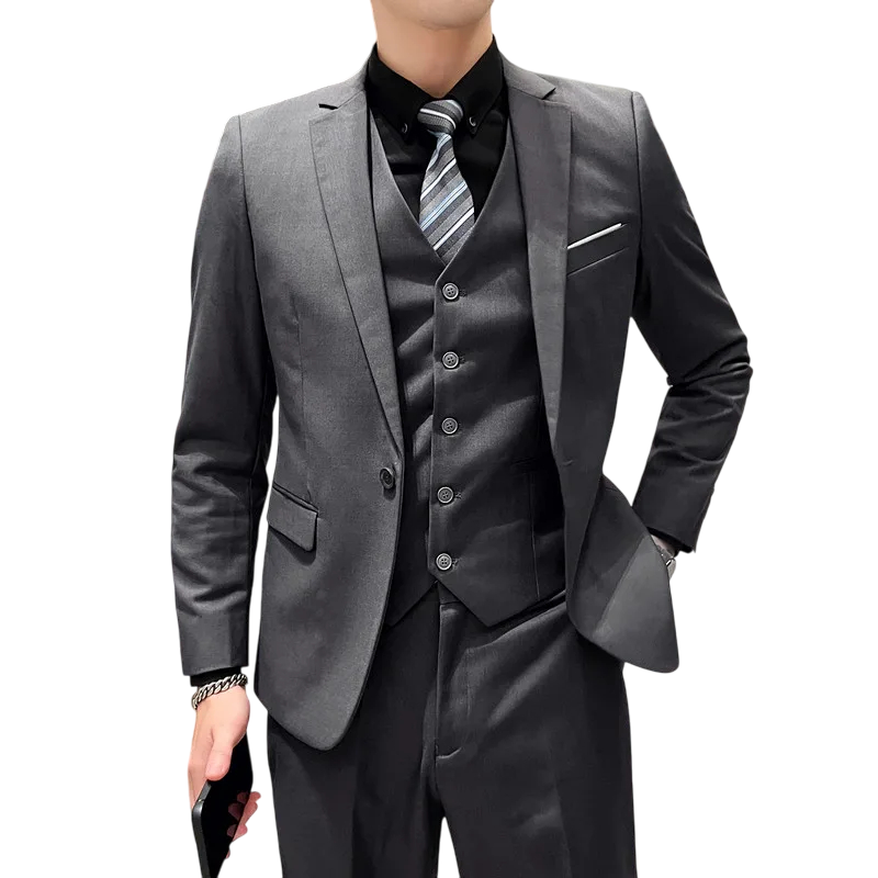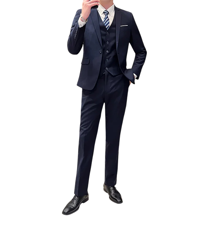 Tento pánský oblekový set z kvalitního polyesteru představuje perfektní rovnováhu mezi elegancí, pohodlím a praktičností. Set obsahuje sako, vestu a kalhoty, které společně tvoří sladěný a moderní komplet vhodný pro společenské akce, svatby i pracovní prostředí. Polyesterový materiál je lehký, odolný vůči pomačkání a snadno se udržuje, což z něj činí ideální volbu pro každodenní nošení. Jednobarevný design podtrhuje nadčasovou eleganci a umožňuje snadnou kombinaci s různými doplňky. Styl doplňuje zapínání na knoflíky a kapsy, které poskytují nejen praktičnost, ale i klasický formální vzhled.