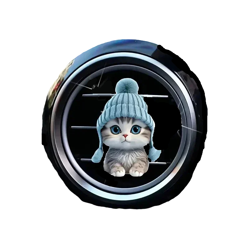 Parfémový klip do auta je navržen jako kombinace osvěžovače vzduchu a dekorativního prvku pro interiér vozidla. Tento model zaujme svým 2D motivem malé kočky s výraznýma očima, která má na hlavě pletenou čepici s bambulí. Díky velikosti přibližně 6 cm je dobře viditelný na ventilační mřížce, aniž by překážel při běžném používání.