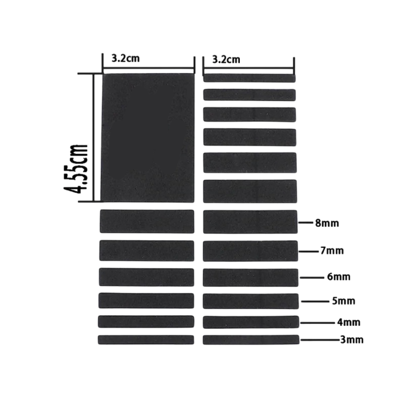 Na obrázku je patrné, že sada obsahuje více pásků různých tvarů a velikostí. Různé varianty pásků poskytují flexibilitu při přizpůsobení různým typům prstenů. Uživatel si tak může vybrat ideální variantu pro konkrétní šperk.