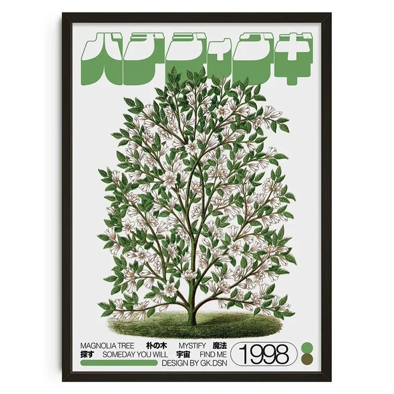Plakát na zeď s motivem stromu magnolie v japonském stylu přináší do interiéru klidnou atmosféru a přírodní motiv. Detailně zpracovaná ilustrace zachycuje rozkvetlý strom s jemnými květy a listy, které působí harmonicky a vyváženě. Kombinace botanického motivu a minimalistického pozadí umožňuje snadné začlenění do různých typů interiérů.