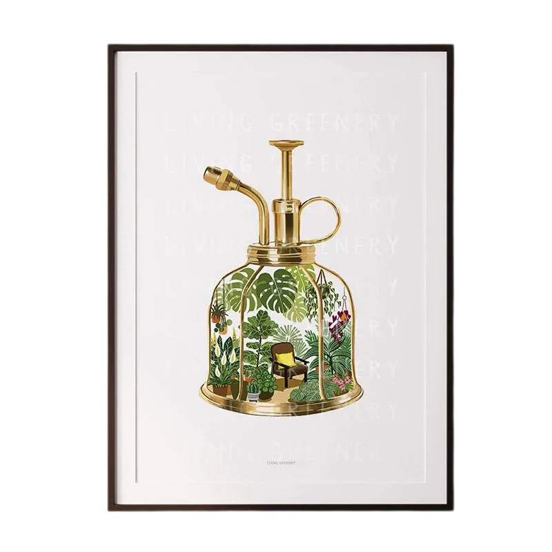 Ilustrace zachycuje rozprašovač, ve kterém jsou umístěny květiny a drobné dekorativní prvky. Tento motiv vytváří zajímavý kontrast mezi technickým předmětem a přírodou. Plakát je řešen jako měkký formát bez rámu, což umožňuje jeho jednoduché přizpůsobení různým typům interiéru.
