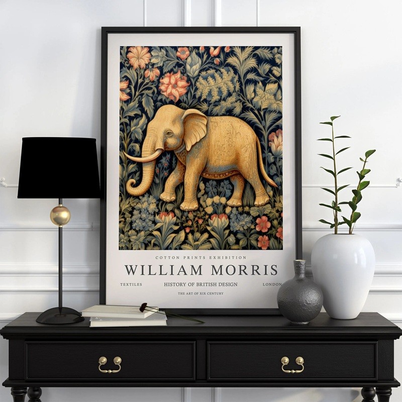 Plakát s motivem slona zasazeného do bohatého botanického prostředí vychází z dekorativního stylu Williama Morrise. Ilustrace kombinuje zvířecí motiv s detailně zpracovanými rostlinami a květy, které vytvářejí výraznou kompozici. Barevné ladění v odstínech béžové a modré působí kontrastně a zároveň harmonicky. Rozměr 20x30 cm umožňuje snadné umístění na stěnu nebo kombinaci s dalšími obrazy. Materiál tvoří polyesterové plátno, které je patrné svou strukturou. Produkt slouží jako dekorace na zeď do interiéru.