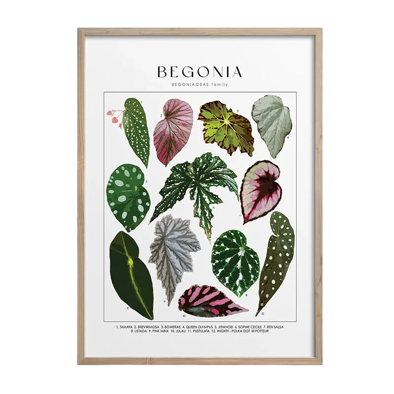 Motiv begónie se hodí do interiérů, kde je důraz kladen na přírodní prvky a klidnou atmosféru. Různorodost listů vytváří vizuálně zajímavý celek, který nepůsobí rušivě. Plakát je vhodný do obývacího pokoje, ložnice i pracovny, kde může sloužit jako jemný dekorativní doplněk. Díky svému provedení jej lze snadno kombinovat s dalšími botanickými motivy nebo minimalistickými prvky.