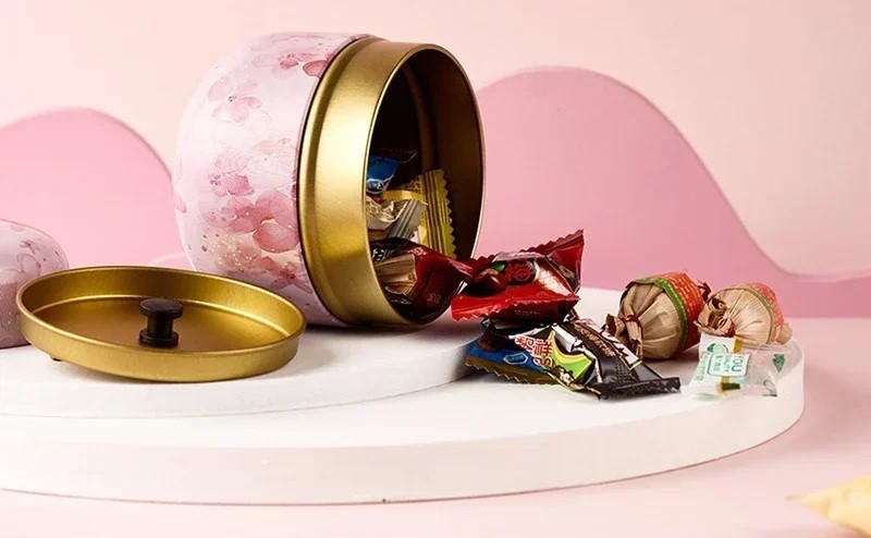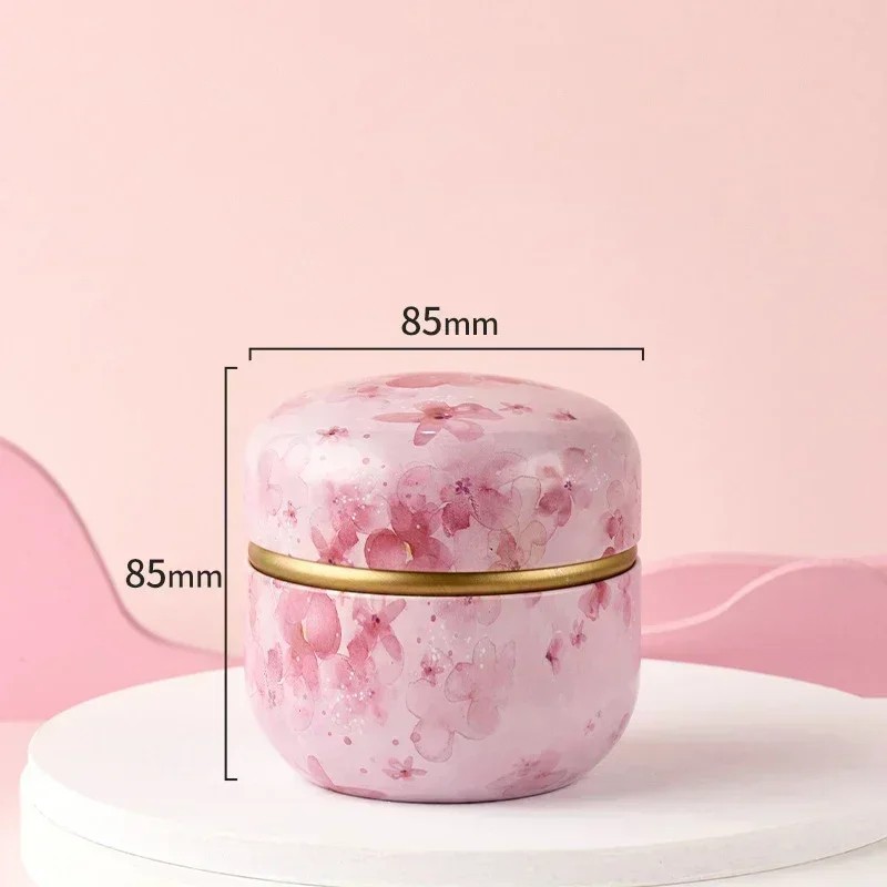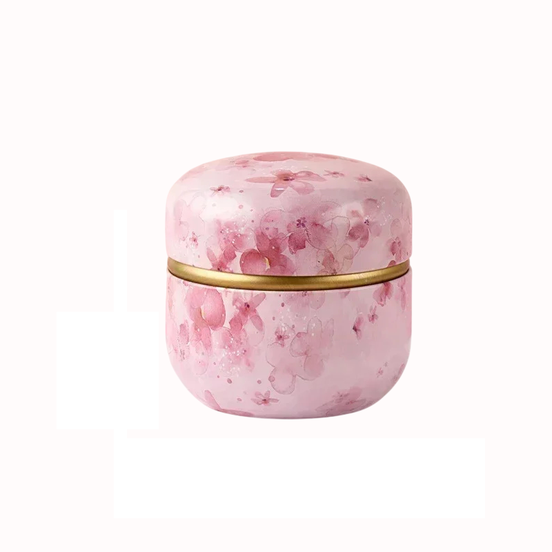Podklad krabičky je laděn do světlé růžové barvy, která se místy zesiluje do sytějších tónů. Barevné přechody jsou plynulé a nepravidelné, což podtrhuje přirozený vzhled dekoru. Celý design působí jemně, lehce a dekorativně. Mezi horní a spodní částí krabičky se nachází prstenec ve zlaté barvě, který opticky odděluje jednotlivé části a vytváří kontrastní prvek vůči jemnému podkladu. Tvar krabičky je zaoblený, bez ostrých hran, s mírně klenutým víkem.