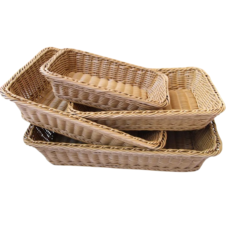 Velký obdélníkový košík z PP imitace ratanu vhodný na pečivo i drobnosti. Praktický doplněk pro servírování i organizaci. Celý popis