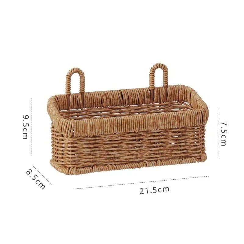 Materiál tvoří plast v imitaci PP ratanu, který napodobuje vzhled klasického pleteného košíku. Tento materiál je lehký a zároveň dostatečně pevný pro každodenní používání. Díky tomu si košík zachovává svůj tvar i při časté manipulaci. Rozměry 7,5 × 21,5 × 8,5 × 9,5 cm zajišťují praktické využití pro drobnosti, které chcete mít stále po ruce.