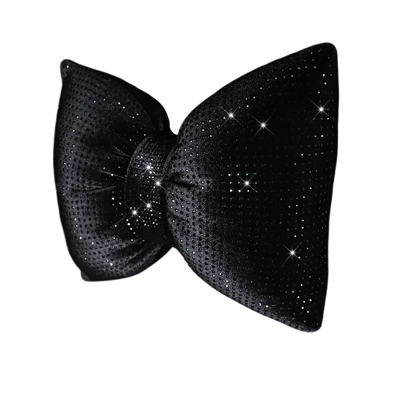 Povrch polštáře je zdoben třpytivými kamínky, které vytvářejí výrazný efekt a dodávají celému doplňku jedinečný styl. Tvar mašle není pouze dekorativní, ale také funkční – rozšířené boční části umožňují pohodlnější opření během jízdy. Polštář tak spojuje estetiku s praktickým využitím.