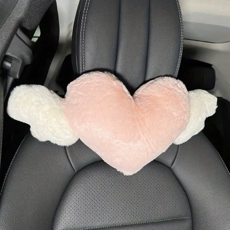 Polštář do auta ve tvaru srdce plyšový měkký růžovo bílý dekor s křídly doplněk na autosedačku pro pohodlné cestování