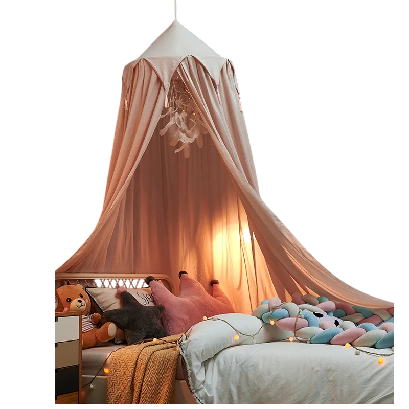 Materiál tvoří polyester a bavlna, což zajišťuje kombinaci lehkosti a pevnosti. Jemná struktura tkaniny umožňuje proudění vzduchu, takže prostor pod baldachýnem nepůsobí uzavřeně. Díky tomu je vhodný pro každodenní použití v ložnici i dětském pokoji.