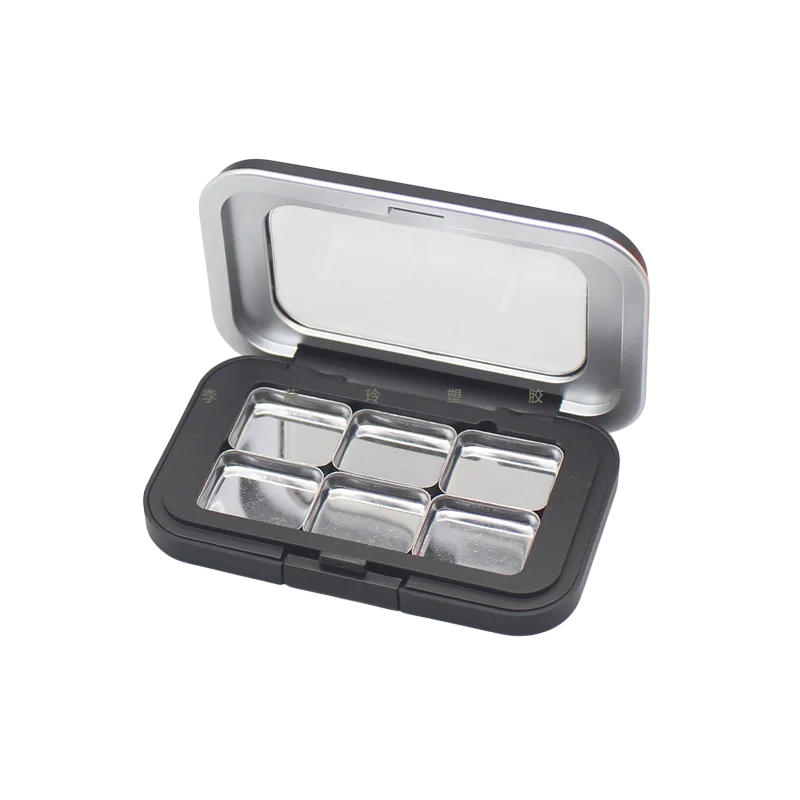 Prázdný plastový obal na kosmetiku se 6 okénky 80,2 × 50 mm kompaktní plastová krabička černá s průhledným víkem na stíny