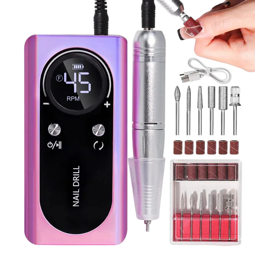 Přenosná elektrická bruska na nehty 45000RPM s LCD displejem, dobíjecí a nízkohlučná manikúra pro salon, 2h dobíjení, 10h výdrž Tato profesionální elektrická bruska na nehty je navržena pro efektivní a tichý výkon při manikúře a pedikúře. S otáčkami až 45 000 RPM a inteligentním LCD displejem je ideální pro všechny typy nehtů, poskytující kvalitní a detailní výsledky. Je vybavena dobíjecí funkcí, což umožňuje až 10 hodin nepřetržitého použití po 2 hodinách nabíjení. Díky nízké hlučnosti a kompaktní velikosti je skvělá jak pro domácí použití, tak pro profesionální salony. Tato multifunkční bruska zahrnuje širokou škálu nástavců a příslušenství, které umožní přizpůsobit ji různým potřebám a aplikacím. Můžete ji využít nejen na úpravu nehtů, ale také na zpracování kůže, odstraňování ztvrdlé kůže nebo pro vytváření různých tvarů a dekorací. Design je ergonomický, což zajistí pohodlné držení i při delší práci. **LCD displej** zobrazuje aktuální rychlost a stav baterie, což zajišťuje plnou kontrolu nad celým procesem. **Vlastnosti produktu:** - **45000RPM** otáčky pro rychlou a efektivní práci - **LCD displej** pro zobrazení rychlosti a stavu baterie - **Nízkohlučný** motor pro tichý a komfortní provoz - **Až 10 hodin** provozu na jedno nabití po 2 hodinách dobíjení - **Multifunkční využití** – vhodná pro manikúru, pedikúru i další kosmetické úpravy **Obsah balení:** 1x hlavní stroj 1x nástavec 1x držák na pero 1x propojovací kabel 1x nabíjecí kabel 1x sada vrtáků na nehty 1x uživatelská příručka Tato bruska na nehty představuje ideální nástroj pro profesionály i domácí uživatele, kteří chtějí dosáhnout perfektního výsledku při úpravě nehtů. Je kompaktní, výkonná, tichá a navržená tak, aby vyhovovala širokému spektru potřeb. Je perfektní volbou pro každého, kdo hledá vysokou kvalitu a efektivitu v oblasti manikúry a pedikúry.