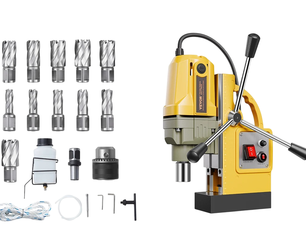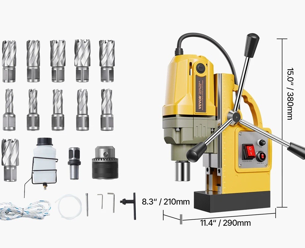 Přenosná magnetická vrtačka 1400W elektrická s vrtáky a příslušenstvím žluto černá magnetická základna pro vrtání kovů