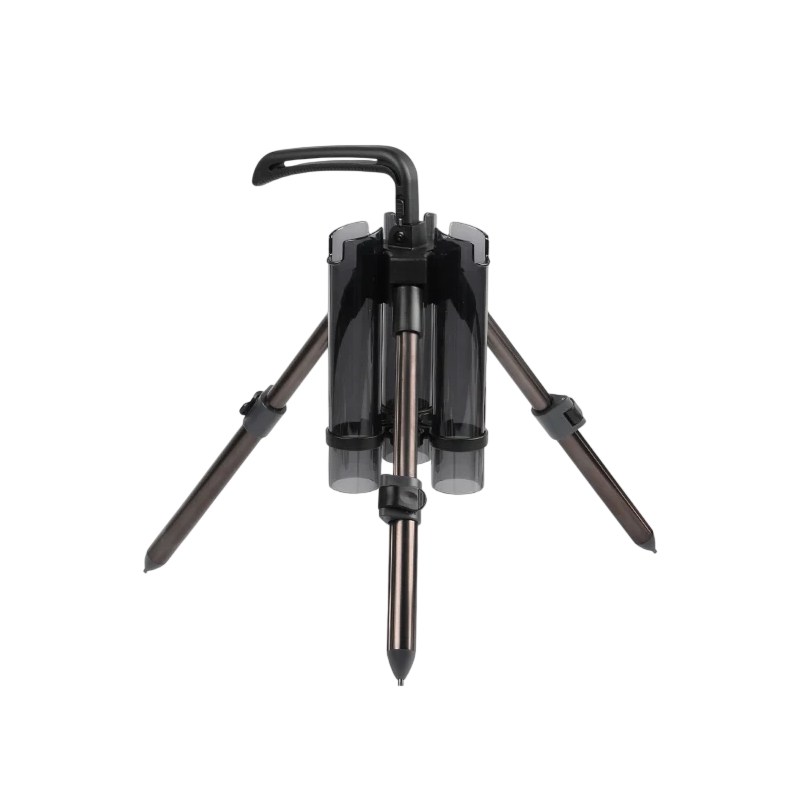 Stativ je vybaven třemi opěrnými nohami, které zajišťují stabilní základnu. Spodní část obsahuje hrot pro zapíchnutí do země, což pomáhá udržet stojan pevně na místě i při nerovném povrchu. Horní část slouží k uchycení prutu.