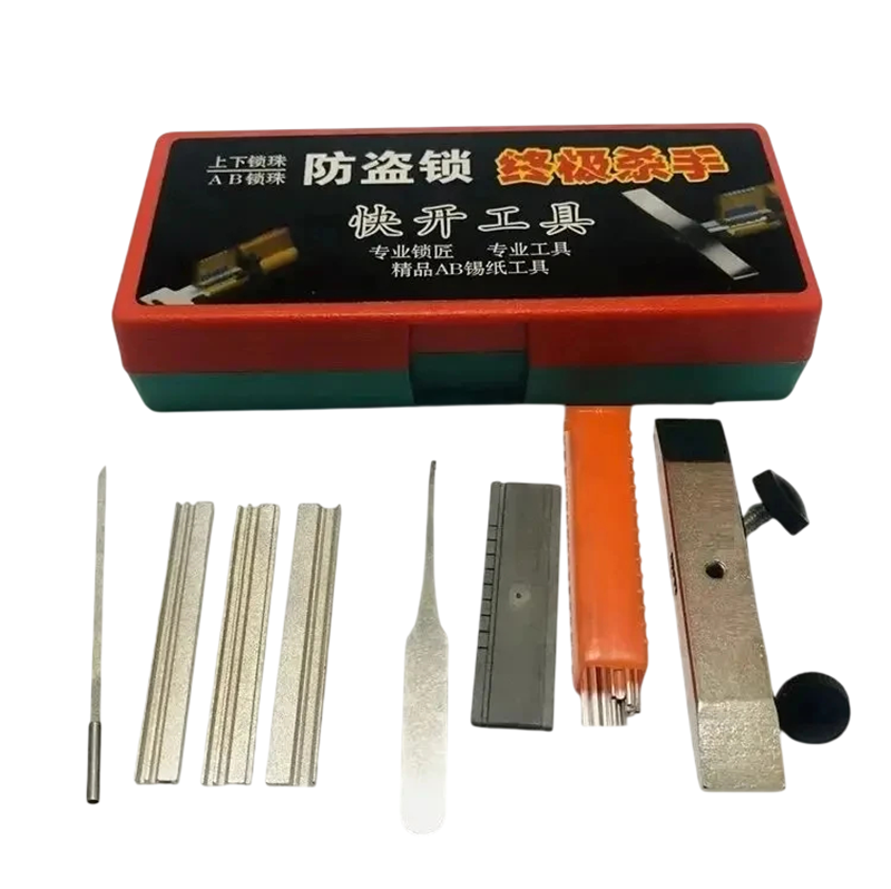 Sada obsahuje více druhů nástrojů, včetně tenkých planžet, vodicích prvků a dalších pomůcek. Tyto nástroje mají úzký profil, který umožňuje práci uvnitř zámkového mechanismu. Součástí balení jsou také doplňky pro manipulaci a nastavení, které rozšiřují možnosti použití. Konstrukce jednotlivých nástrojů je navržena pro přesnou práci v omezeném prostoru.
